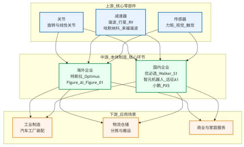人形机器人产业链可划分为上游核心零部件、中游本体制造和下游场景应用三大环节。