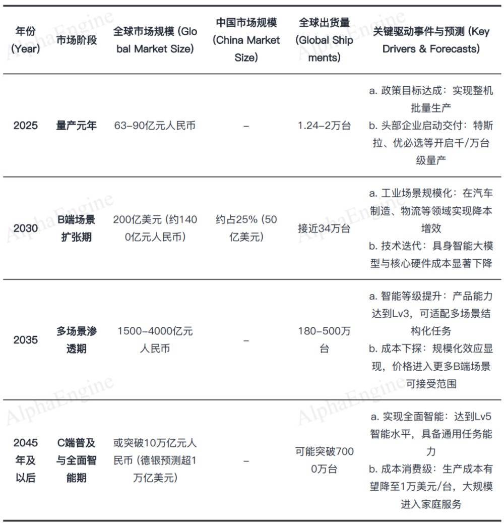长期来看,人形机器人有望实现 C 端普及,全球出货量超 7000 万台,市场规模突破 10 万亿元。