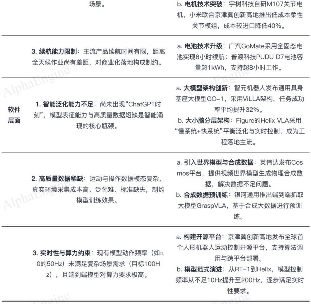 硬件层面聚焦于“降本、量产、续航”三大核心挑战,而软件层面则致力于解决“智能泛化、数据稀缺、实时性”三大技术瓶颈。