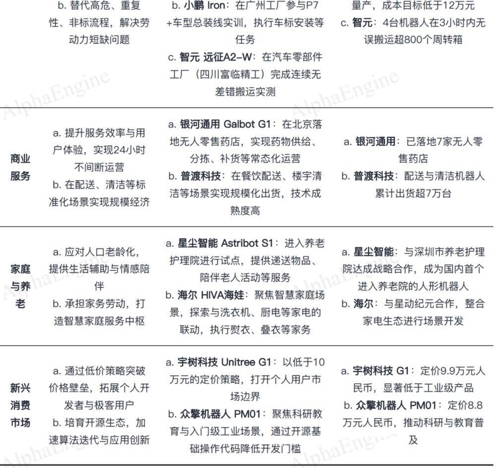 人形机器人产业化遵循“工业制造→商业服务→ 家庭服务”的场景递进路径。
