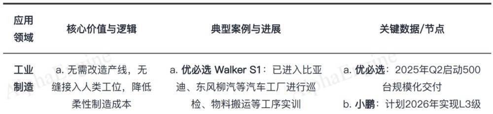 工业制造是首要落地场景,特别是汽车工厂,如优必选 Walker S1 已进入比亚迪和东风柳汽的产线进行实训。
